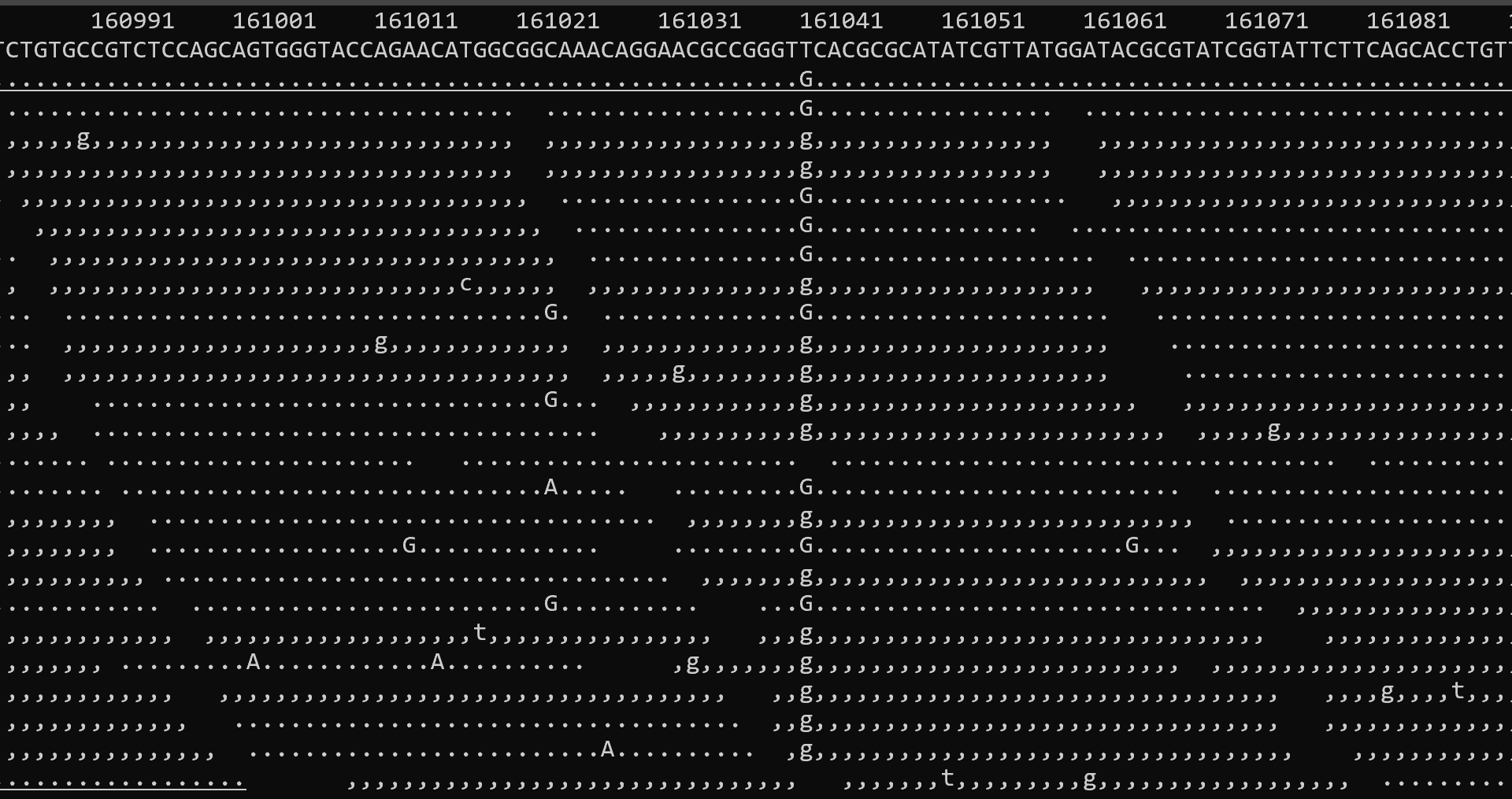 samtools index SRR030257.cfsm.bam # インデックス作成🔰 samtools tview でリードのマッピング状況を可視化してみよう。 (矢印キー ←/→ で移動できる。)